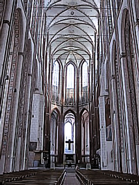 Die Errichtung der gewaltigen Backstein- Kirchen der Gotik ist in den einzelnen Städten nicht zufällig in zeitlicher Nachbarschaft betrieben worden: Der Bau von St. Marien in Lübeck, der »Mutterkirche der Backsteingotik«, wurde um 1250 in Angriff genommen und ein Jahrhundert später in der Hauptsache abgeschlossen. Das war die Vorgabe für die nicht minder stolzen Bürger Danzigs, die den Bau ihrer Marienkirche veranlassten, als in Lübeck die Errichtung von St. Marien noch nicht ganz vollendet war. Die »Krone Danzigs« erreichte nicht die Gewölbehöhe des Lübecker Vorbilds (»nur« 30 Meter), dafür übertrifft sie ihre Lübecker Schwesterkirche mit einer Gesamtlänge von 105 Metern um etwa 2,5 Meter. St. Marien in Stralsund wiederum, begonnen in den letzten Jahren des 13. Jahrhunderts, ist »nur« 100 Meter lang, dafür ist ihr Gewölbe aber etwa 2,5 Meter höher als das der »Krone Danzigs«. Aber es ging ihren hauptverantwortlichen (und in der Hauptsache bezahlenden) Bauherren aus der Gilde der Gewandschneider auch in erster Linie darum, die Dimensionen von St. Nikolai in der eigenen Stadt in den Schatten zu stellen. Denn die sich »vornehmer« dünkenden patrizischen Handelsherren, die St. Nikolai als »Ratskirche« (dementsprechend in unmittelbarer Nähe des Rathauses) seit etwa 1270 errichten ließen (nach dem Vorbild von St. Marien in Lübeck, was sonst?) saßen in ihrem prächtig geschnitzten Gestühl unter einem Gewölbe von »nur« 29 Metern Höhe, mehr als drei Meter niedriger als das der nur wenige Fußminuten entfernten St. Marienkirche der Gewandschneider. Die sorgten auch dafür, dass »ihre« Turmspitze sich mit 151 Metern in für damalige Verhältnisse ungeheuerliche Höhe reckte und dementsprechend den nur etwas mehr als 102 Meter erreichenden Wetterhahn des Südturmes von St. Nikolai klein erscheinen ließ. Die ehrgeizigen Bauherren von St. Marien bezahlten dies allerdings damit, dass der erste Turm 1382 – vermutlich aufgrund von Konstruktionsmängeln – einstürzte und dabei Teile des bereits fertigen Langhauses zerstörte. Der unverdrossen und unerschrocken sofort danach erfolgende Neubau des Turmes hat in seiner Wucht und Stärke keine Parallele in der Backsteingotik. Der Eindruck, den der Eintretende nach dem Durchschreiten des Portals in der dem eigentlichen Kirchenschiff vorgelagerten Turmhalle erhält, ist wahrhaft atemberaubend. Die heute sichtbare, nach einem Brandschaden 1708 fertiggestellte barocke Turmhaube erreicht allerdings auch nur noch 102 Meter Höhe.