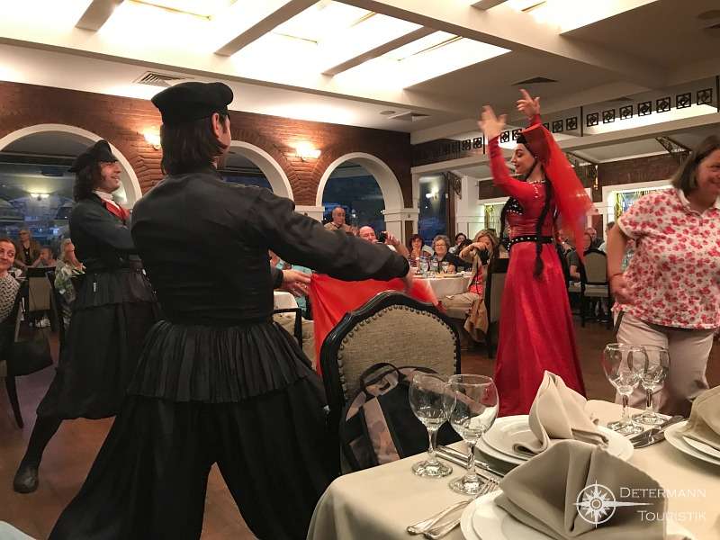 Den Abend verbringen wir in einem typischen georgischen Restaurant. Eine Folklore-Gruppe bringt uns die temperamentvollen Tänze nahe. Prächtige Kostüme und die schnellen rhythmischen Bewegungen begeistern. Nach gutem georgischen Essen und vielen Trinksprüchen unseres Tamada schwingen auch wir vergnügt das Tanzbein – ein unvergesslicher Abend.