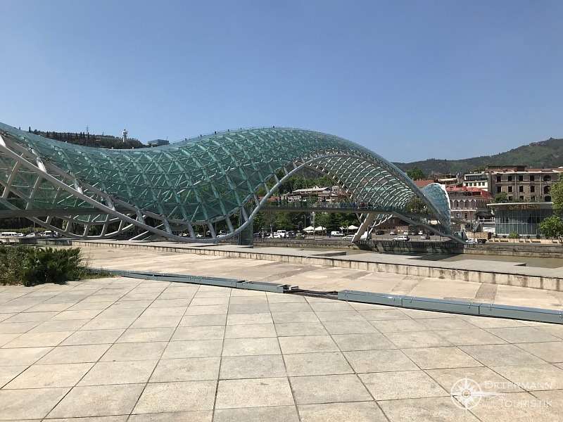 Große Höhenunterschiede sind innerhalb der Stadt zu überwinden. Treppen führen von einem Hügel zum anderen. Ein Wasserfall mitten in der Stadt, Brücken mit Liebesschlösser, viele Jugendliche, Musik auf den Straßen, aber auch sehr moderne Bauten, wie etwa die Friedensbrücke über die Mtkvari (Kura), erbaut von dem italienischen Stararchitekten Michele de Lucchi. Die Lichtinstallation aus 30.000 LED-Leuchten fasziniert die Gruppe.