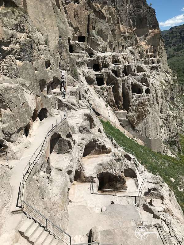Die Fresken in der kleinen orthodoxe Höhlenkirche zeigen König Giorgis III. mit seiner Tochter Tamara, die ein Modell der Kirche in ihren Händen trägt. Ein komplexes Tunnelsystem mit vielen unbefestigten Treppenstufen erkunden wir mit unseren Handy-Taschenlampen, da die Beleuchtung ausgefallen war – ein wirkliches Abenteuer, nicht ungefährlich, in Deutschland undenkbar. Die Festung, die das Höhlenkloster bildete, war sowohl für die Mongolen als auch durch die Osmanen nicht zu erobern. Sie fiel nur deshalb, weil die Eroberer durch Verrat von den unterirdischen Gängen erfuhren. Nach Eroberung durch die Osmanen verfielen die Höhlen, wurden durch Erdbeben schwer beschädigt und nur vereinzelt von Hirten bei Unwettern als Unterschlupf für das Vieh benutzt. Zahlreiche Höhlen sind inzwischen dank Restaurierungsarbeiten wieder zugänglich. Eine kleine Gruppe orthodoxer Mönche lebt noch heute in einem Höhlenkomplex.