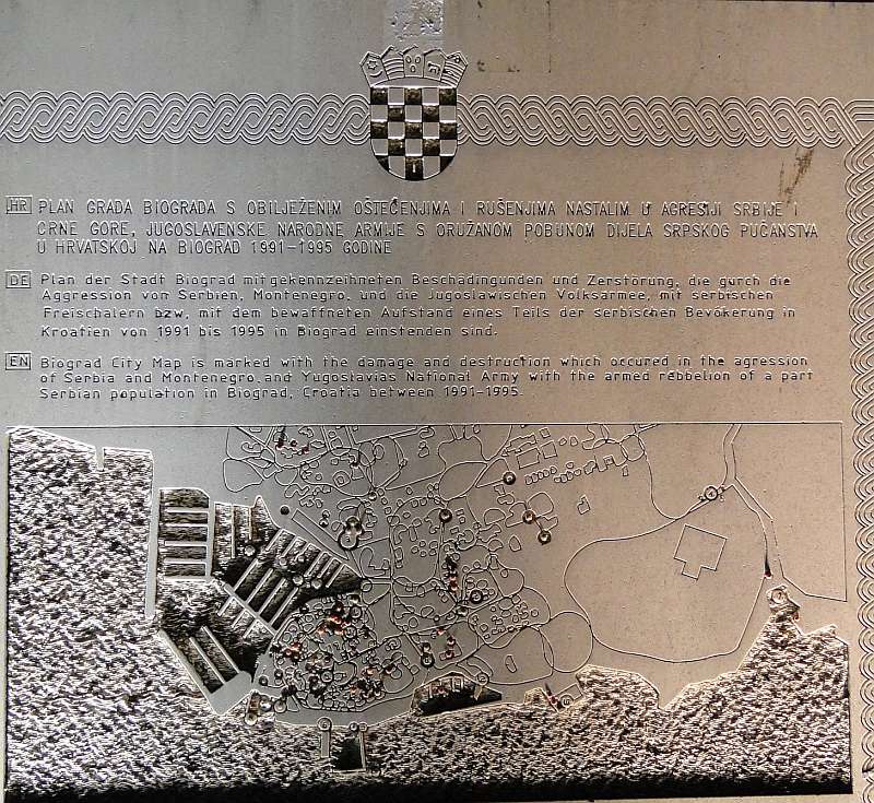 Und ach, man könnte, ja müßte ein Buch schreiben, über das was wir in diesen wenigen Tagen alles sehen. Denn Zadar ist nur eine unserer Stationen in Kroatien. Zuvor waren wir schon in Slowenien, sind von Kärnten her durch die Karawanken zum schönen See von Bled gefahren, haben dort die Jagd-Villa gesehen, die Tito sich einst selbst schenkte (allen politischen Differenzen zum Trotz im protzigen Stil der stalinistischen Architektur), sind ins unverkennbar habsburgisch geprägte Ljubljana weiter gereist, haben dem heute italienischen, einstmals ebenfalls habsburgischen Triest eine Stippvisite abgestattet (sträfliche Vernachlässigung eigentlich), waren in Pula (wieder tief zurück in die römische Vergangenheit), in Opatija eigentlich nur zum Schlafen (eine weitere Sträflichkeit), folgen über Rijeka der istrischen zur dalmatinischen Küste, verlassen viel zu schnell Zadar, um in Biograd zu übernachten, begegnen dort nicht leibhaftig Ante Gotovina, wohl aber einer Gedenkplatte, die auch deutsche Besucher über die kroatische Sicht auf den Krieg zwischen 1991 und 1995 aufklären möchte.