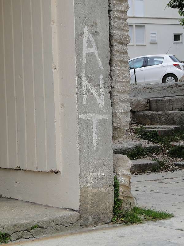 Tief taucht also der Betrachter ein in die Geschichte, wenn er die Donatus-Kirche betrachtet. Nur wenige Schritte weiter indes überfällt einen geradezu die Gegenwart. An der Ecke eines schmucklosen, ein wenig heruntergekommen wirkenden Wohnblocks prangt unversehens der Name „Ante“. Und zwar nicht so wie zuweilen Liebesbotschaften übermittelt werden, mit Herz oder dergleichen, sondern recht groß, auffällig, wenn auch etwas ungelenk, vielleicht eilig an die Wand gepinselt.