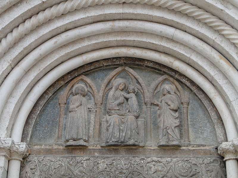 Tja, und all dies kann einem durch den Kopf gehen an einer eigentlich unscheinbaren Straßenecke in Zadar, dessen Ehrenbürger Ante Gotovina kaum zwei Wochen nach seiner Haftentlassung geworden ist. Aber eigentlich habe ich dazu überhaupt keine Zeit. Denn nur wenige Schritte weiter erreichen wir die Kathedrale der Heiligen Anastasia, ein imposanter Bau, dessen romanische Fassade im 12./13. Jahrhundert entstand. Allein vor dem wunderschönen Marien-Tympanon des Hauptportals müßte man lange verweilen …